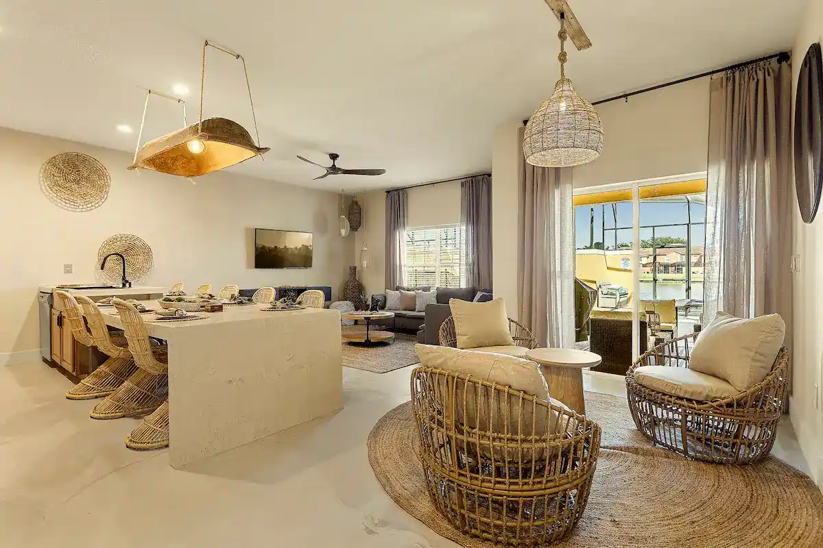 This private oasis is where you can relax and unwind in style. You'll find a spacious living area, complete with an open, full kitchen, and a dining space that seats 8. The rooms are designed in the same boho chic aesthetic as the rest of the house. This is definitely a space where you can peacefully retreat after a full day at the parks.