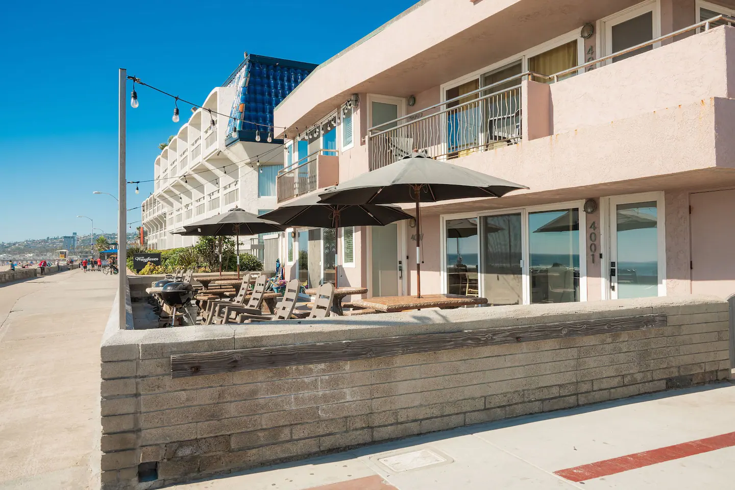 - Top-notch amenities: Access to pools, fitness centers, fire pits, and tennis courts–making it one of the best beachfront Airbnbs in San Diego with a pool.