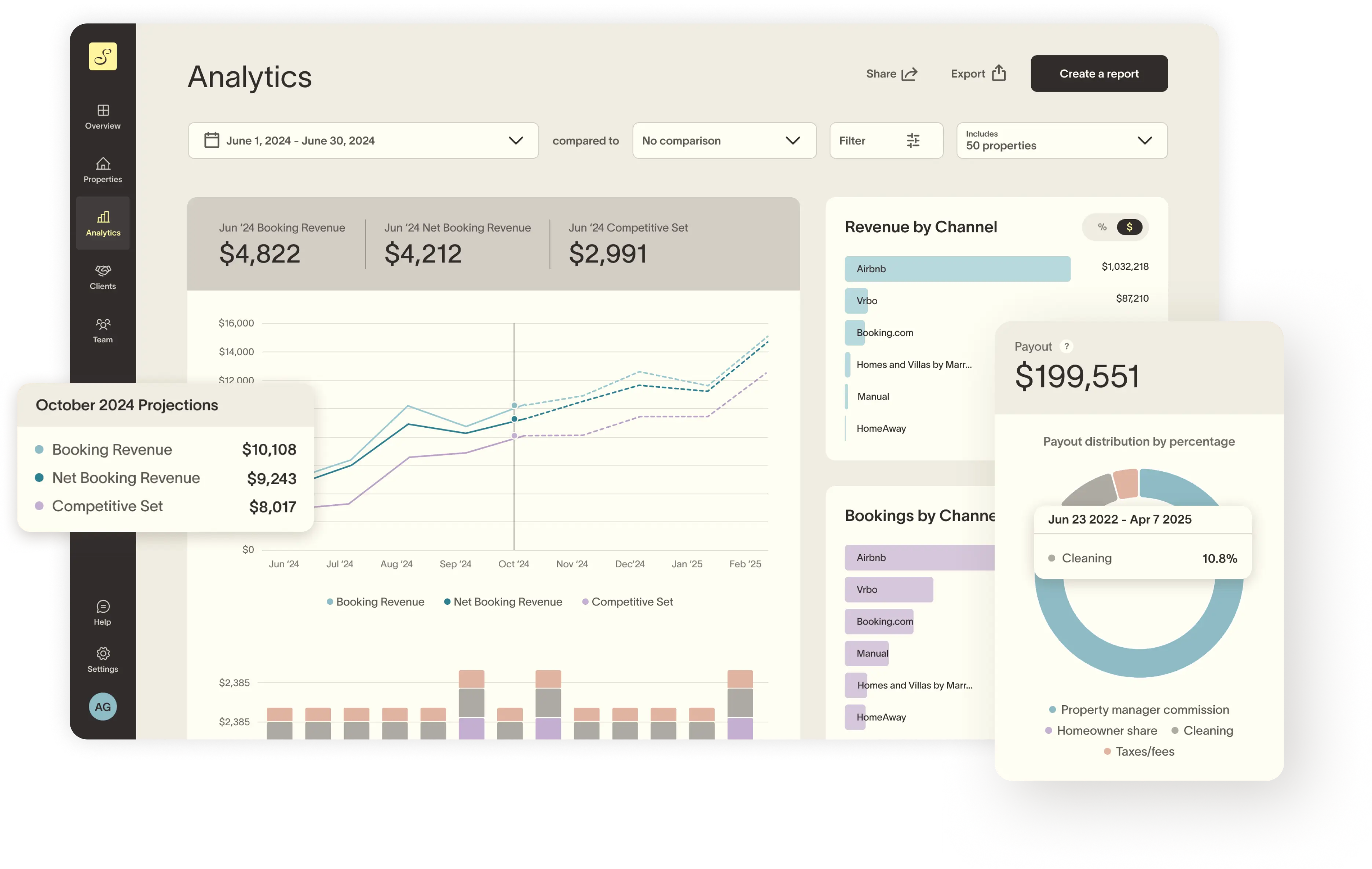 - Booking channels: Airbnb, Vrbo, Booking.com, Expedia, Google Vacation Rentals, Homes & Villas by Marriott Bonvoy, Hopper, HomeToGo, Plum Guide, Travelstation, Holidu, Smiling House, Villa Tracker, VacayHome, bnbfinder, Rentalz, and others